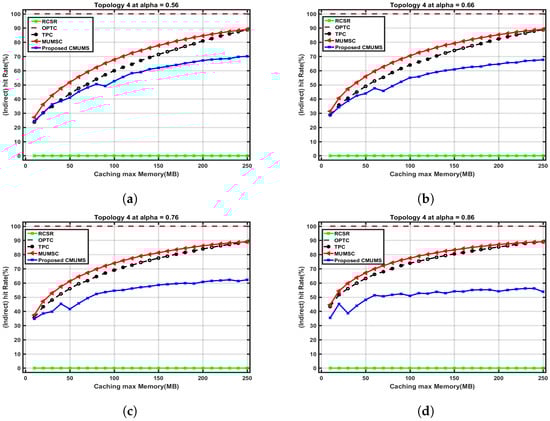Indirect hit rate vs. caching max Memory (Q) up to 250 MB at different . (a) Indirect hit rate vs. Q (at = 0.56 as per []); (b) Indirect hit rate vs. Q at = 0.66; (c) Indirect hit rate vs. Q at = 0.76; (d) Indirect hit rate vs. Q at = 0.86.