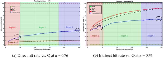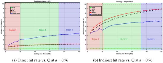 - Region 2: at certain Q values, the redundancy effectiveness threshold is considered a starting point to represent the enhancements of CMUMS. It illustrates an incremental behavior in direct hit rate as in Figure 11a in contrast to the decremental behavior in indirect hit rate as in Figure 11b compared to the referenced algorithms in [].