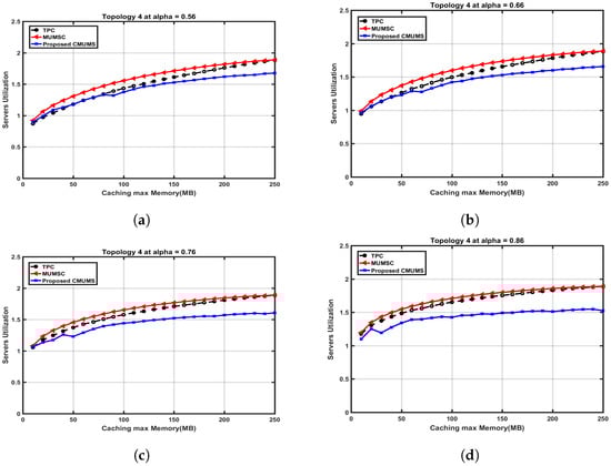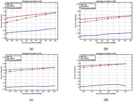 Server processor utilization ratio vs. caching max Memory (Q) up to 250 MB at different . (a) Server utilization ratio vs. Q (at = 0.56 as per []); (b) Server utilization ratio vs. Q at = 0.66; (c) Server utilization ratio vs. Q at = 0.76; (d) Server utilization ratio vs. Q at = 0.86.