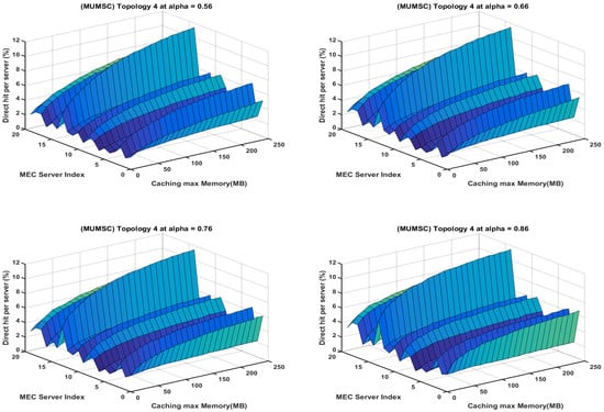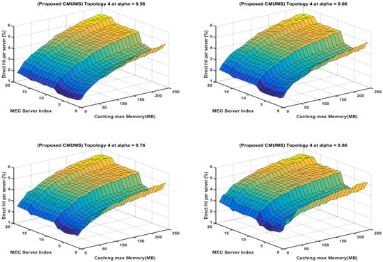 As observed, the CMUMS cluster formation and the task redundancy design enhancements can considerably promote the caching hit ratio and decrease downloading the content from the center cloud server (which means the task is cached in one of the MECs in the cluster or via agent/proxy server) when compared with the referenced algorithms in []. Moreover, the proposed CMUMS also optimizes the overall delay as the requested tasks will be almost found within the clusters; hence, the delay is minimized. In the following comparisons, we explore the direct and indirect hit rate, server occupancy and caching capacity at different values. The assumed average task size is 10 MB. Topology 4 is chosen as a case study to illustrate the following comparisons. We also discuss the CMUMS algorithm behavior at different popularity factor . The value indicates the steep of the curve and hence affects on the number of highly popular tasks to be cached and on which servers. i.e., tasks with small popularity may not be cached or ignored. In Figure 9, we measure the direct hit rate versus caching maximum capacity Q at different Zipf values 0.56, 0.66, 0.76 and 0.86.