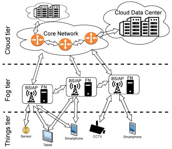 Let us present the three-tier network model used in this work. In the bottom tier of the network, there is a set of MD (e.g., smartphones) with specific computational requests. We assume that serving these tasks requires offloading them to one of the FN or CN, constituting the second and the third tier, respectively. The MDs cannot process these tasks on their own because of energy or computational limitations. The MDs send computational requests using wireless transmission to one of the nearby FNs. As shown in Figure 1, FNs are located at BS or AP, close to the end users. Then, each task can be processed either in one of the FNs out of set or in the cloud tier (set of CN). Unlike MD, nodes in the fog and cloud tiers of the network are interconnected with wire-based communication technology.