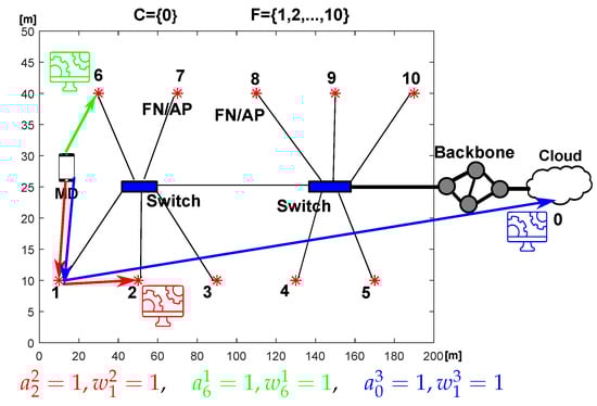Let us define a binary variable that shows where the request is computed, i.e., equals 1 if is computed at node and 0 otherwise. Similarly, let us define a binary variable that indicates if request r is wirelessly transmitted from MD to FN .