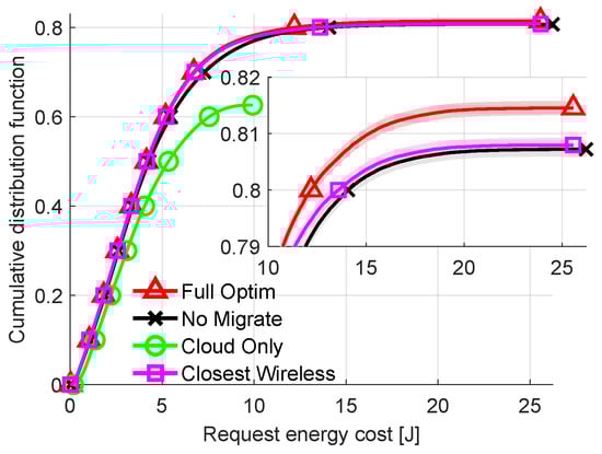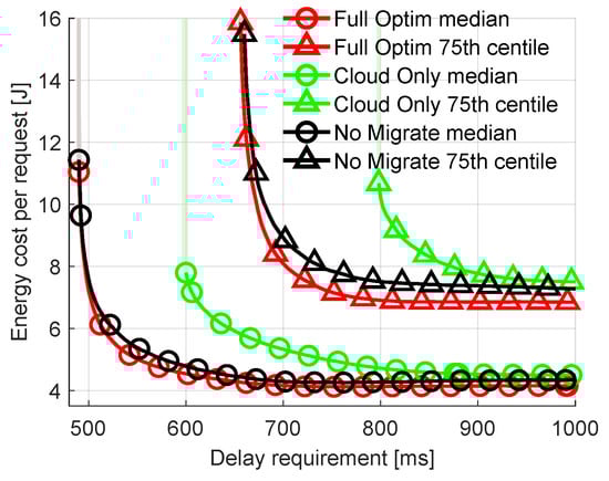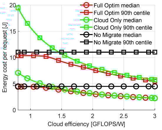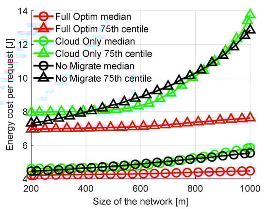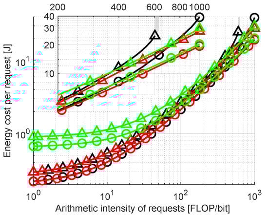 where is the energy required to transmit request between FN and node , while is the energy-per-bit cost of this transmission. Energy-per-bit cost can be derived from [], where the power consumption of networking equipment increases linearly with load starting from idle power. This relation can also be seen in measurements of core routers [,]. There is no wired communication between nodes if the request is processed at the same node to which it is wirelessly transmitted by the MD, i.e., .