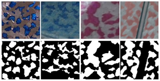In total, eight different types of backgrounds and foregrounds of the scraping dataset were collected, as shown in the first row in Figure 12. 80% of the image patches divided from the scraping database of each color type were used for training and the remaining 20% were used for testing. Furthermore, the training data is divided into 90% for training and 10% for validation, as shown in Table 1. The training dataset of each of the eight different scraping datasets is combined into an overall training dataset to train a single model.