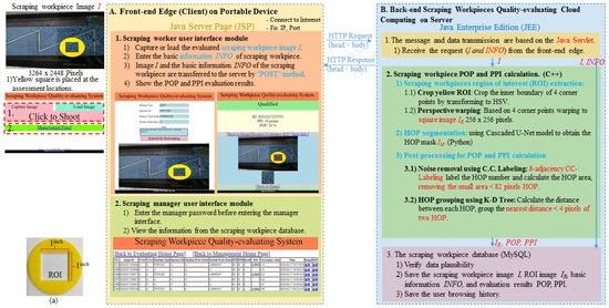 The edge interface is designed with the use of the Java Server Page (JSP) that operates on the browser. The interface of the edge consists of two modules, which are the scraping worker user interface module and the scraping manager user interface module. The scraping worker user interface module provides the scraping workers with the opportunity to gain access to the service from the server to evaluate the scraping workpieces, instantly. The users upload the image of awaited-evaluation scraping workpieces I(x, y) captured from the camera of a portable device or the device’s inner storage. To capture a recognizable image for further calculation of POP and PPI, another requirement of the mobile device is equipped with a camera with a resolution of beyond 10 MP. Additionally, every uploaded image requires a yellow square with the inner side of 1 inch by 1 inch, as shown in Figure 3a, placed at a location that is to be measured to provide the entire image with a reference scale to detect the actual size of the area and make our working distance flexible. The entire evaluation image I(x, y) is transferred to the server via the “POST” method. The communication between the browser and server is completed with the use of HttpURLConnection.