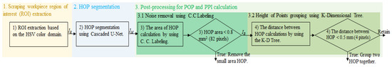To detect the region of interest (ROI) from the inner rectangle of the yellow square in the image I, the image I is converted from an RGB color space to an HSV color space to easily differentiate each color. The hue value ranging from 50 to 60 are used to extract the yellow square from the image I. In the next step, the corner extraction is performed. To obtain more stable results and satisfy the spec of minimum area of 0.01 mm2, the square area of ROI must be larger than 256 × 256 pixels, retaking image I is required otherwise. Then the area of ROI will be projected to an image IR(x, y) using perspective transformation with the size of 256 × 256 pixels, as shown in Figure 11a. Note that the up-scaling technique is not applied to avoid producing an artifact in the image, which can cause an inaccurate calculation on POP and PPI. Downscaling, on the other hand, will benefit computational time, making the whole process run faster. After the ROI image IR(x, y) is extracted, each channel of an input RGB image is normalized (4) from the range between 0 and 255 to the range between −1 and 1. Subsequently, the ROI image IR′(x, y) enters the Cascaded U-Net network to predict the multi-scale segmentation mask of HOP and a segmentation mask of the HOP border. Ultimately, the highly precise segmentation mask of HOP predicted by the final stage is selected as the final result. Afterward, the C.C. Labeling and K-Dimensional Tree (K-D Tree) algorithms are applied on the mask of HOP produced by the Cascaded U-Net model to do the post-processing method, which is based on the experience of scraping workers in calculating POP and PPI.