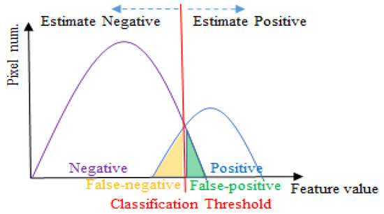 We aimed to follow the idea from the architecture of YOLOv4 proposed by Alexey Bochkovskiy et al. [44], which consists of a backbone, neck, and head, corresponding to the encoder, decoder, and classification of most architectures of semantic segmentation [9,13,14,23,32], respectively. The modifications of recent methods are focused mainly on the backbone and neck of the architecture to obtain informative feature maps for final classification. Rethinking the head of the U-Net, it acts as a classification that merely applies a single 1 × 1 convolution. In terms of semantic segmentation, which is a pixel-wise classification, it is difficult to obtain high-quality prediction by pixel-wise classifying the informative features via only a signal classifier since the common problem of classification is that it is hard to utilize a signal classifier to classify the hard classification, which is the area overlap between the positive and negative, into true positive or true negative, as shown in Figure 5. Therefore, the classifier often misjudges the hard classification, which is also interpreted as the confusion region, the area adjacent to the object border, in the task of semantic segmentation, causing the object border to be overkill or producing a false positive. Thus, the cascaded structure is applied to the head of a novel network proposed by us, namely Cascaded U-Net, for multi-stage classification. As shown in Figure 6, Cascaded U-Net also consists of three parts, which are the encoder, decoder, and cascaded multi-stage head, respectively.