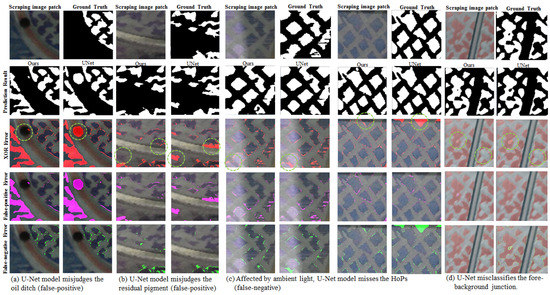 In our previous research, the HOP segmentation was based on the original U-Net model. However, the prediction error rate, which consists of false-positive error and false-negative (missing) error was higher than the specification error rate, which is less than 5%. The false-positive error resulted mainly from the model misjudging the oil ditch and residual pigment as HOP because the color brightness of the oil ditch and the residual pigment was dull, similar to the color brightness of HOP (see Figure 7a,b). As for the false-negative error, it primarily arose from the insignificant contrast of the HOP with the background. Since the materials of HOP are mostly metal, which is susceptible to ambient light in any actual environment, capturing the scraping image under such glare caused the overexposed problem of the HOP (see Figure 7c). In conclusion, the problems occurring in our previous method were that the low-gradient information flow was not effectively propagated through the deeper layer and therefore the subtle information could not be well classified.