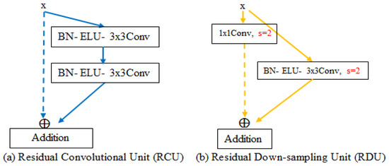 The encoder consists of four stages, each of which contains a residual down-sampling unit (RDU) and two residual convolutional units (RCU), except the first stage. In the first stage, a 7 × 7 convolution was equipped rather than an RDU because using a bigger receptive field to extract features from the input image made it possible to observe a bigger morphological object before determining what was to be extracted to obtain much more useful information. To achieve the residual connection between the feature maps generated by 7 × 7 convolution and the RCU, by utilizing element-wise addition, both numbers of feature map channels were set to the same numerical value, which was 64. The modification of the RCU was based on an optimal version of the convolutional unit in the ResNet [24]. To enlarge the interval of the distribution, and simultaneously retain the negative values of the input which was produced by normalizing the pixel intensity values of the input image, rectified linear activation (ReLU) was replaced by the exponential linear activation function (ELU), as shown in Figure 8a.