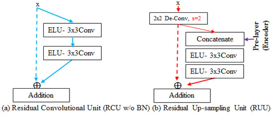 As shown in Figure 9b, the RUU, designed to possess dual inputs for two different sizes of feature maps, was used for up-sampling the smaller feature maps produced by the previous block and concatenating the fine features whose size is two times as large as that of the smaller feature maps, generated from the encoder. In further explanation, the RUU initially applied the two-stride 2 × 2 de-convolution, which can be regarded as a learnable up-sampling operator, to generate amplified feature maps that are two times the size of the original one but whose channel size will be divided by two. To restore the fine information, such as the border information, amplified feature maps were concatenated with the corresponding size of the feature maps generated by the second RCU of each stage in the encoder. The combined featured maps went through two repetitive calculation operators, which are the ELU and the 3 × 3 convolutional layer, and then the output feature maps were fused with the amplified feature maps via element-wise addition. In fact, the feature maps from the encoder retain more detailed information compared with the feature maps in the decoder and both feature maps possess a different number of non-linear transformations, so that both in different spatial dimensionality without doing any transformation were unable to merge directly and effectively. Hence, the feature maps from the encoder were not exploited to perform identity mapping. The experimental results also show that the performance of the feature maps from the encoder, combined with the amplified feature map and transformed by two repetitive calculation operators, is better than that of the feature maps directly used as identity mapping. Not only did the decoder up-sample and enrich the feature maps but it also interpreted and classified the feature maps. To maintain the original value calculated by 3 × 3 convolution, the design of the RCU differed from the encoder by getting rid of the BN layer, as shown in Figure 9a. This argument is proved in our experimental result.
