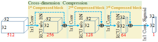 The output feature maps from the fourth stage of the encoder are used as the first stage of the classification, and the rest of the stages of classification are from each corresponding stage of the decoder. If high-dimensional feature maps from the early stage directly go through 1 × 1 convolution to reduce dimensionality and information fusion, feature maps cannot effectively take spatial information fusion into account. Therefore, before 1 × 1 convolution is carried out on high-dimensional feature maps for classification, the proposed “Cross-Dimension Compression” (CDC) gradually fuses and compresses the features across the depth of the feature maps while maintaining the original resolution of feature maps. The CDC is a flexible module, which is made of a chain of multiple compressed blocks, each of which consists of a 1 × 1 convolution and an RCU without the BN layer. Since 1 × 1 convolution is not capable of taking spatial patterns into account, the RCU is connected after the 1 × 1 convolution. The number of compressed blocks depends on the dimension of the feature maps. For example, the feature map dimension in the first stage is 512 channels, and therefore compressed blocks are used three times to reduce the dimension to 64 channels, as shown in Figure 10.