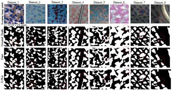 Comparison of prediction results between U-Net and our model on the eight different types of scraping images. The first row and second row are eight different types of scraping image patches and the pixel-wise ground truth that corresponds to the patch, respectively. The third row and fourth row are the prediction result predicted by our model and U-Net, respectively.