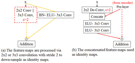 In addition, the purpose of the RDU, which replaces the operator of two-stride max-pooling is to down-sample the feature maps for increasing the receptive field of the model, and effectively reducing the computation and simultaneously maintaining the continuous propagation of the information flow. After yielded from the RCU, the feature maps sequentially go through the Batch-normalization (BN) layer, the ELU, and the two-stride 3 × 3 convolutional layer, which causes the size of the feature maps to be divided by two; however, the number of channel sizes will be doubled during feature maps down-sampling on the two-stride convolutional process. To conduct element-wise addition for the residual connection, the two-stride 1 × 1 convolution is used on the input of the RDU to generate feature maps of the same dimension, as shown in Figure 8b. The reason for exploiting two-stride 1 × 1 convolution without considering neighbor information to perform identity mapping is that exploiting the 3 × 3 or 2 × 2 convolution, which is similar to performing a low-pass filter, to perform identity mapping that will obscure the original information. The argument mentioned above is also proved in our experimental results.