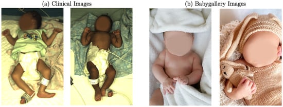 Example images for (a) clinical dataset and (b) baby gallery dataset (faces intentionally blurred).