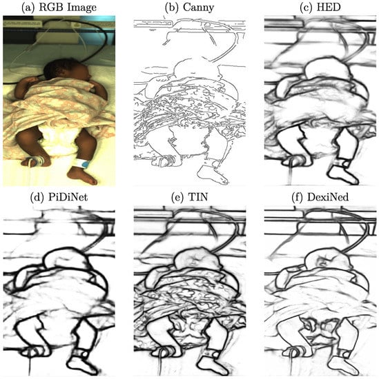 When looking at the well-known Canny edge detector [27], depicted in Figure 3b, nonclosed edges can be observed. Since it is a threshold-based technique, actual edge pixels might be rejected, which can result in difficulties for the generator in understanding how to reconstruct related image parts. Further, textured surfaces with patterns, such as blankets, created sharp edges. In the reconstruction, these structures could be hard to process. Thus, further edge detection algorithms were examined. The first DL-based detector analyzed was the Holistically-Nested Edge Detection (HED) method [28], whose produced edges can be observed in Figure 3c. A drawback of using this method could be the level of streaking around generated edges. Therefore, the edges were not particularly clean and were relatively thick compared to the other methods. Only rough outlines were detected, while many details, such as facial features or clothing, were lost. The Pixel Difference Network (PiDiNet) detector [29] produced similar edge images compared to HED. There was much less streaking, and the edges were cleaner, while the amount of details was comparable to HED. As depicted in Figure 3e, the edges produced by the Traditional Inspired Network (TIN) detector [30] showed an increase in sharpness while also capturing more details such as facial features. However, the detector also extracted less important details in the clothing. This could result in a biased focus during the training step of the cGAN. The last method analyzed was the Dense Extreme Inception Network (DexiNed) [31], which showed further improvements in the edge quality and sharpness, as well as the number of details captured.