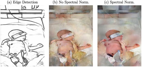 Pix2PixHD is an advanced multiscale architecture for high-resolution I2I translation [12,32]. The original Pytorch implementation of the approach was used in this work. While the method was first used for generating photorealistic images from semantic label maps, it also allows custom conditions for training. According to experiments described in the Pix2Pix method [11], edge detections generated using the HED approach and sketches (which can be seen as edge representations) were used to synthesize RGB images. Although advanced research has been conducted since the release of Pix2Pix and Pix2PixHD, the training process of GANs regarding a balance between generator and discriminator still remains a challenge. During an imbalanced training, the performance of the discriminator could increase so much that it perfectly distinguishes real and fake images [33]. This would completely prevent the generator from training. Therefore, Miyato et al. proposed a weight normalization technique called “spectral normalization” to stabilize the training of the discriminator [34]. Spectral normalization restricts the maximum gradient of the discriminator function and, therefore, allows a more stable training of the network without a great implementation effort. Since this technique was not included in the original implementation of Pix2PixHD, it was added and applied to every convolutional layer in the discriminator while batch normalization was removed. An example edge detection image (using DexiNed) and the corresponding generated data using the proposed cGAN with and without spectral normalization can be observed in Figure 4. One can see that the use of spectral normalization (Figure 4c) created a more realistic image of a neonate. A comparison to the image generated without the balanced training (Figure 4b) shows the influence of color consistency on the skin.