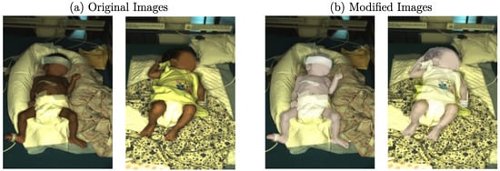 In the first stage, the volunteer was successively shown 10 generated images with replaced backgrounds. Thus, it was evaluated whether they look real or fake (generated) to capture the first impressions of a standalone image without any bias. In the following stages, 2, 3, and 4, 10 image pairs consisting of a real and a generated image were provided in various combinations regarding (replaced) background. Since the cGAN was trained with image data of European neonates, it was expected that the skin tone of generated images would reproduce this feature from the training dataset, which was indeed observed in preliminary results. Therefore, a ground truth dataset was created for the MTurk-like survey by recoloring the neonatal mask from the original clinical dataset. It was converted into the YUV color space, where Y encodes the luminance and U and V represent the chrominance. The brightness was adapted by increasing the luminance values while applying the contrast-limited adaptive histogram equalization (CLAHE) [40] implementation from OpenCV to the Y channel to prevent clipping. An example of color modification can be observed in Figure 6. While Figure 6a shows the original images, the recolored images, used as ground truth in the MTurk-like survey, can be seen in Figure 6b.