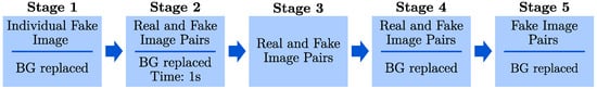 The second stage aimed to analyze the human perception regarding basic features of the images, such as the shape or skin tone of the neonates. Therefore, a time-limited comparison was performed. Ten (recolored) original images were compared to generated images (background replaced) for only 1 s. Since the average human reaction time is on the order of 250 ms [41], the time limit was doubled for two images. Afterward, the images were concealed, and the turkers were asked which image was considered more realistic. The time limit was only applied to the second stage, so more detailed features could be analyzed in further stages. Stage three also provided 10 pairs with recolored images and generated frames with their generated backgrounds, but no time limit was present. The sequence order was randomized in all stages to prevent a training effect. In the fourth stage, 10 (recolored) original images were compared to generated images with their backgrounds replaced. Thus, the influence of background replacement was evaluated. In the last stage, generated images with their backgrounds replaced were compared to generated images with their generated background. This was conducted to measure any improvement effect in quality by replacing the generated backgrounds. Figure 7 illustrates the validation process with all described stages.