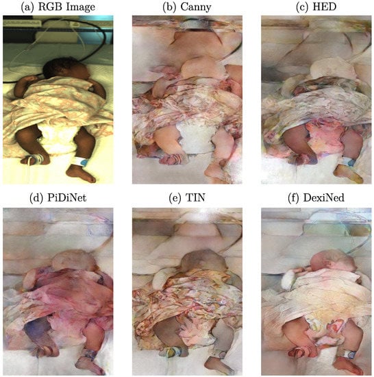 Finally, the resulting image generated using the edges created from the DexiNed detector is illustrated in Figure 8f. Due to fewer details extracted from structured surfaces, a lack of textures on the blanket was observed. This positively affected the generated image since the blanket was more evenly colored without a noisy texture. However, the missing border between the blanket and the diaper resulted in the colorization of the diaper. The most important improvement was the more realistic-looking skin tone generated by the network. Both the legs and the head were reconstructed better with a clear distinction to the background compared to previous attempts. However, in this context, the arms still revealed unrealistic colorization. Since the edges’ thickness again varied between TIN and DexiNed, the increase in quality could be correlated to the decrease in edge width. Further, the edges around the arms were thicker compared to the legs, while the latter body parts showed problems with colorization, which emphasized this assumption. The generated images using the edge images created by the DexiNed detector were revealed to be the most realistic photos regarding human perception for all conducted trainings. Therefore, further results presented will be based on edge images from this detector. The presented results, in general, showed a high variance regarding the colorization of skin areas and structured surfaces. The reconstruction of, e.g., the colorization of the blanket, indicated that no bias due to overfitting was observed in the training pipelines. The qualitative results regarding the influence of the used edge detectors on the generated RGB images are summarized in Table 2. Positive (+) and negative (−) influences on the level of realism of the output images were assessed.