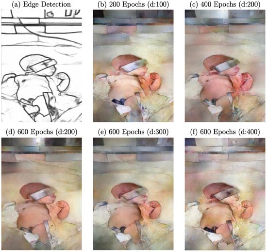 Next to the choice of the network parameters, there were also challenges regarding the edge detection images generated from the RGB training dataset. In many images, nonclosed edges, highly detailed textures, and thick outlines were present, which resulted in a decreased performance of the generator and therefore revealed significant limitations of the approach. Further, light reflections could lead to falsely detected edges. Due to the dataset’s nature, the neonates’ position strongly varied from image to image. Thus, complex poses could also influence performance. In the process of training GANs, computational costs are one of the most important aspects. Due to the specific model architecture and the mode of feature learning, the training periods for GANs can be highly increased compared to simply feedforward neural networks. Although a necessary enlargement of the dataset would probably increase the model’s performance, it would also increase training duration.
