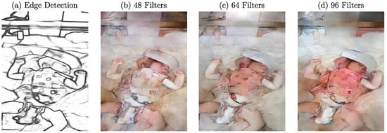 (a) Example edge detection image with resulting images after training with (b) 48, (c) 64, and (d) 96 filters in the first convolution stage of the generator.