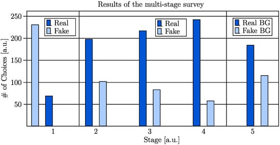 The results of the MTurk-like validation process are illustrated in Figure 11. The number of choices can be observed for all stages. While for stage one, the choices for individual generated (fake) images are illustrated, the remaining stages reveal the choice of which of two shown images (fake vs. real) was classified as more realistic.
