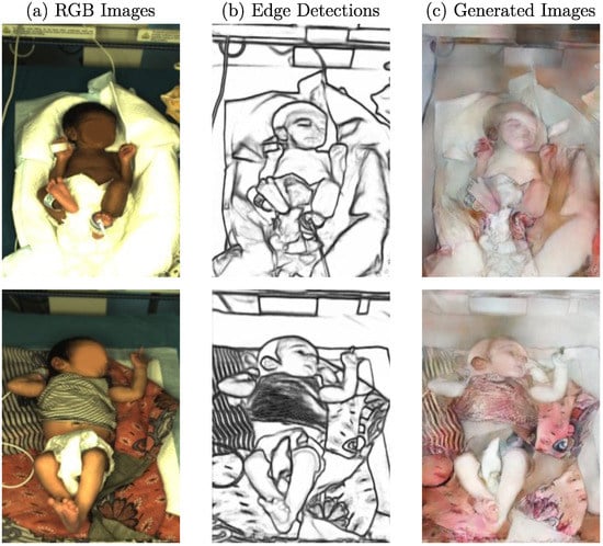 However, the level of realism was still very poor for some clinical images, so many challenges must be addressed. The used edge images significantly influenced the quality of the generated image. In order to further improve the visual quality, more robust and advanced edge detectors could be used in the future. Additionally, preprocessing of the dataset or postprocessing of the generated edge images could be implemented. Texture or pattern suppression is especially of great interest since this was identified as one of the main issues when generating RGB images. The used condition itself could also be changed. Instead of only relying on edge information, other types of labels could be additionally used, e.g., semantic labels, which are already implemented in Pix2PixHD. Here, a label mask containing the edges would be created, which could encompass labels for skin, clothes, blankets, pillows, or even more specific labels such as different body parts. Further, since also infrared images were recorded in the described study, more advanced fusion algorithms based on GANs [45] could be used for the generation of condition images. In order to evaluate the actual usage of the generated data for augmentation, the images will be used in the training steps of different DL approaches such as segmentation [46], and body pose estimation [26]. Here, the performance change of using the data in the training step and the prediction score of using the images as test data will be investigated. Finally, an increase in training data would result in a potential improvement. By increasing the amount of training data, a more general representation of a newborn could be learned. Thus, more robust DL-based image processing techniques could be implemented and trained, which could be used for real-time camera-based vital signs measurement in preterm infants to replace the potentially harmful state-of-the-art cable-based sensors and electrodes.