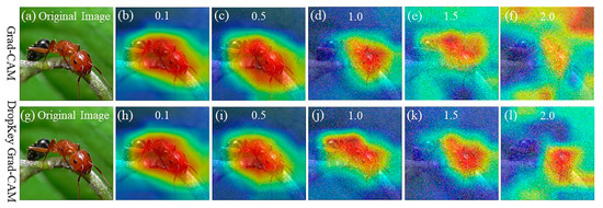 On the other hand, Grad-CAM improved with the Dropkey algorithm consistently demonstrates superior localization performance when the noise variance is 1.0 or below (Figure 2h–j). It is evident that both Grad-CAM and the optimized Dropkey-based Grad-CAM effectively highlight the object of interest under a variance below 1. However, the optimized Dropkey-based Grad-CAM provides more detailed visualizations compared to Grad-CAM under a variance of 1 (Figure 2d,j). Remarkably, even in the presence of noise with a variance of 2.0, the improved Grad-CAM based on Dropkey does not exhibit misclassifications, as depicted in Figure 2l. With gradually increasing Gaussian noise, the optimized Dropkey-based Grad-CAM visualization method demonstrates excellent robustness, preserving the stability of visualization results and accurately highlighting the featured objects in the image. In contrast, Grad-CAM exhibits noticeable degradation effects under the same noise interference, resulting in visual distortions and uninterpretable outcomes. Moreover, the optimized Dropkey-based Grad-CAM can be applied to most models, making it crucial for interpreting the logical decision information of computer vision models and improving their interpretability.