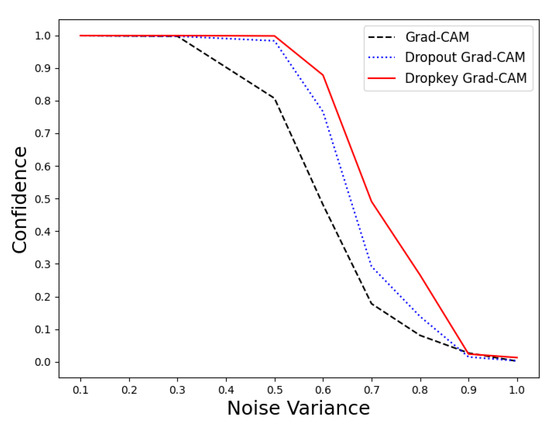 From the data in the graph, it can be observed that when the Gaussian noise variance is below 0.3, all three methods, namely Grad-CAM, Dropout Grad-CAM, and Dropkey Grad-CAM, demonstrate good resistance and maintain a high level of confidence. However, when the Gaussian noise variance reaches 0.5, Grad-CAM’s resistance to noise diminishes. Furthermore, during the transition from a variance of 0.5 to 0.9, all three methods experienced a decrease in confidence levels. Nevertheless, from the data in the graph, it is evident that Dropkey Grad-CAM exhibits better confidence levels compared to the other two methods under the influence of noise of the same magnitude.