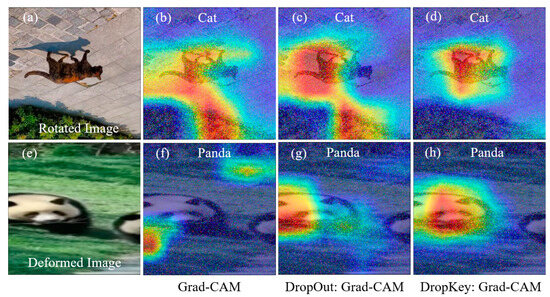 Furthermore, changes in the structure and shape of an image, such as rotation or stretching deformation, can also impact the localization of image features. Image rotation alters the position and orientation of image features, potentially affecting the accuracy of feature localization. Similarly, stretching deformation modifies the aspect ratio of target features, leading to errors in feature localization and weight calculation, thereby influencing the accuracy of the obtained results. As illustrated in Figure 4, both Grad-CAM (Figure 4b) and the improved Grad-CAM based on Dropout (Figure 4c) can locate the target object in the rotated image. However, the positioning of the target object is not sufficiently precise, and classification errors may occur. In contrast, the improved Grad-CAM based on Dropkey can accurately locate target features without any classification errors (Figure 4d). It is worth noting that Grad-CAM fails to locate target features in the stretched image (Figure 4f). Although the improved Grad-CAM based on Dropout can locate target features, its accuracy is compromised, resulting in the loss of edge features (Figure 4g). Conversely, the improved Grad-CAM based on Dropkey can effectively locate target features, delivering more precise positioning results without sacrificing edge features (Figure 4h).