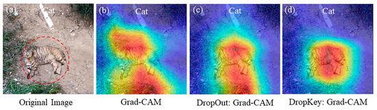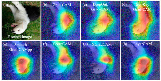 Convolutional neural network (CNN) models have been widely applied in the field of computer vision, such as object detection [1,2] and image classification [3,4], due to their remarkable feature extraction capabilities. However, the complex network structure, parameter sharing, and non-linear operations of CNN models pose challenges in effectively interpreting their output [5,6]. Furthermore, in real-world scenarios, the input images or videos are often non-standard [7]. They are frequently influenced by environmental factors, camera variations, image distortions, and other such factors. These complexities pose challenges to the research on model interpretability. However, despite these difficulties, it remains crucial to address the interpretability of models in order to ensure their effectiveness and reliability in practical applications. Through continued advancements in techniques such as Dropkey Grad-CAM (Gradient-weighted Class Activation Mapping), we can strive to overcome these challenges and enhance the interpretability of models even in the face of real-world complexities. Various methods have been proposed to enhance the interpretability of CNN models, which can be categorized into perturbation-based [8,9,10], propagation-based [11,12], and activation-based approaches. Among the activation-based approaches, Class Activation Maps (CAM) [13,14] have gained significant popularity due to their ability to provide intuitive visualizations for CNNs.