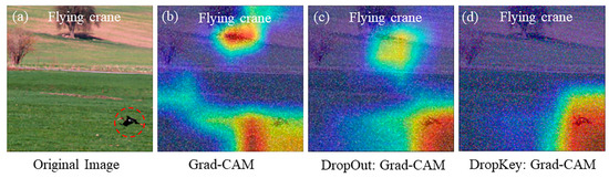 Based on experimental results, it is evident that the original Grad-CAM technique exhibits significant distortions when extracting low-contrast image features, rendering it incapable of effectively locating the target feature objects in the images, as illustrated in Figure 6b. The improved Grad-CAM technique based on Dropout can mitigate some of the noise interference compared to the original Grad-CAM. However, it suffers from the loss of edge information pertaining to the target features, leading to interpretability errors, as shown in Figure 6c. In contrast, the improved Grad-CAM based on Dropkey technology can precisely and clearly locate the key feature objects in low-contrast images. Moreover, it demonstrates superior visualization results in terms of feature edge and texture details, thereby effectively reducing the influence of noise and enhancing the system’s robustness under low-contrast conditions, as shown in Figure 6d.
