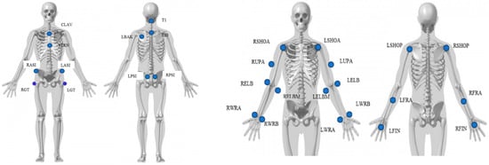 In this dataset, the entire kinematics of the participant’s whole body was captured using a Vicon motion capture system based on reflective markers [16]. Eight cameras were strategically positioned around the workspace, as shown in Figure 1. For marker placement, 43 spherical reflective markers with a diameter of 12.5 mm were affixed to the participant’s skin using double-sided adhesive tapes. A comprehensive description of the markers, including their labels and positions, can be found in Table 1, Figure 2 and Figure 3.