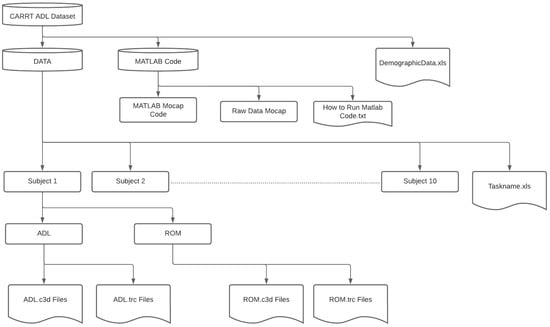The dataset includes a total of nine activities of daily living (ADL) and eight range of motion (ROM) tasks [17]. As this data collection primarily centers on upper body movements, the selection of ADL tasks is based on prior work by the authors of references [18,19,20]. These activities focus on the movement of joints and how humans interact with objects while sitting or standing.