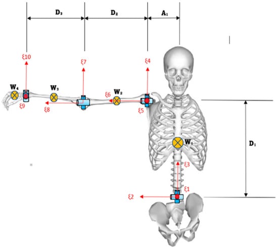 In the RHUBM, the vertical length of the torso is denoted as D1, and the horizontal length of the torso is represented as A1. The upper arm length is measured from the shoulder center to the elbow center, while the forearm length is measured from the elbow center to the wrist center. A2 denotes the upper arm length from shoulder to elbow center, and D3 represents forearm length. Additionally, the length of the hand, denoted as D4, is measured from the center of the wrist to the center of the palm. The mass of each body segment is expressed as a percentage of the total body mass [24]. Graphic descriptions of these parameters used in the RHUBM are provided in Figure 5.