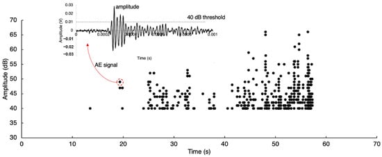 Example of AE amplitude extracted from an AE signal. The red arrow shows the time history signal of the AE hit with an amplitude near 50 dB.