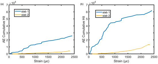 AE cumulative hit versus strain until failure for the two slabs at (a) the support collected from sensor 1 and (b) mid-span collected from sensor 5.