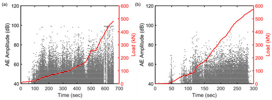 The AE amplitude distribution of sensor 5 (representing the mid-span region) with the increasing load (a) slab 1 and (b) slab 2. The red line shows the applied load, and each black dot shows the amplitude of AE hit.