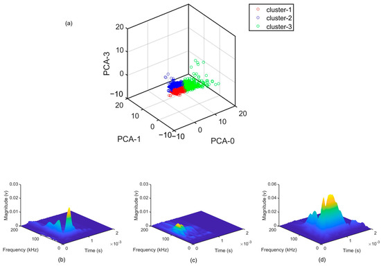 Figure 8 shows three distinct clusters representing the AE sources within the data set. PCA-0 is selected as the x-axis, and PCA-1 and PCA-3 are selected as the other axes to achieve the best separation and optimal visualization. The clusters possess varying characteristics regarding both time and frequency features, as indicated in Figure 8b–d.