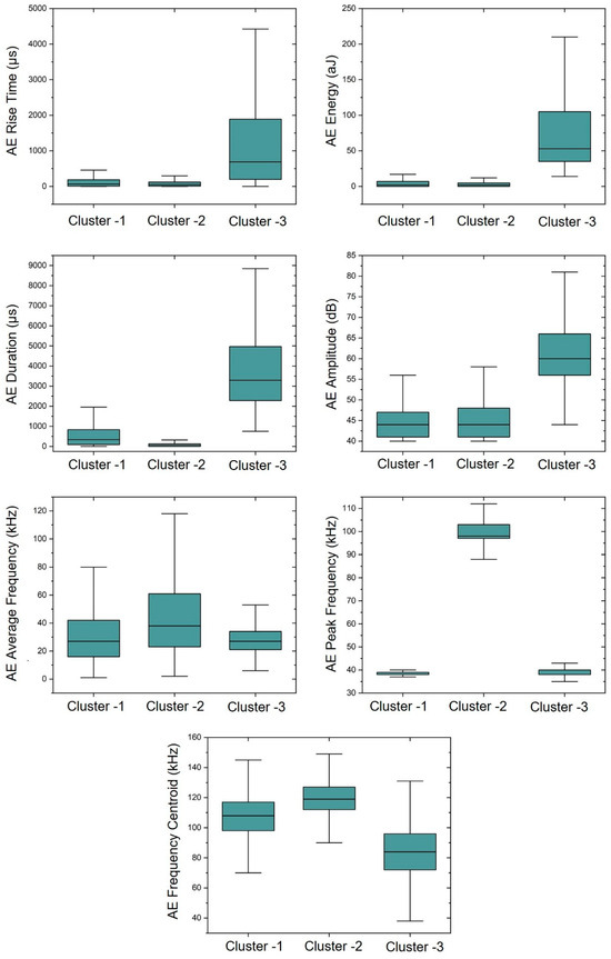 Table 3 and Figure 9 summarize the mean values of the AE features and distribution of data within each cluster. In Figure 9, the boundaries in the box plot represent the 25th percentile and the 75th percentile, indicating the range within which the majority of data points lie. The center line within the box represents the median value, which is the mid-point of the data distribution. The lines extending from the top and bottom of the box are the maximum and minimum value within each cluster. Cluster-1 is the most active data, representing of total AE hits. Cluster-2 has the smallest AE energy and duration while exhibiting the highest AE peak frequency and frequency centroid among the three clusters. Cluster-3 is the least active source, representing of total AE hits. Cluster-3 has the highest AE amplitude, energy, duration and rise time, as well as the lowest average frequency and frequency centroid, which aligns with the characteristics of shear crack in the literature [48,49,50]. The AE feature comparison presented in Figure 9 demonstrates the effectiveness of utilizing the AE features to differentiate the AE clusters. For example, AE rise time, energy, and duration can serve as effective indicators for identifying the cluster-3 while the AE peak frequency can be utilized to differentiate the cluster-2 signal in the AE analysis. It is important to note that the absolute AE features shown in Table 3 are controlled by the AE sensor, threshold, and sensor–source distance. However, the relative behaviors of clusters are expected to be similar for different configurations.