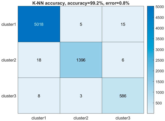 To better understand the relationship between each cluster and its corresponding AE source and evaluate the robustness of this clustering model, a supervised machine learning method using the k-nearest neighbor (K-NN) method [51] was applied to anticipate the cluster label of each AE hit. The data set was divided into half for training and testing subsets. The dissimilarity between each data point was calculated using the Euclidean distance metric because it requires less computational cost, especially in the real time monitoring that collects an extensive dataset. The unit variance scaling and PCA dimensionality reduction in the preprocessing steps would also enhance the performance of the K-NN model when using the Euclidean distance. In addition, to determine the number of neighbors to be selected in the K-NN model, we evaluated different quantities of neighbors. Selecting three neighbors provides the highest accuracy of 99.2%. In contrast, when five neighbors are selected, the prediction error increases to 21.9%. The decision based on one nearest neighbor might not be representative of the overall data distribution, making it susceptible to outliers. Therefore, the number of neighbors was selected as three in the study. The K-NN model’s accuracy is demonstrated by comparing the predicted labels to the actual labels in Figure 10. The values in the non-diagonal positions represent the confusion matrix. The majority of AE signals are classified accurately in their assigned clusters.