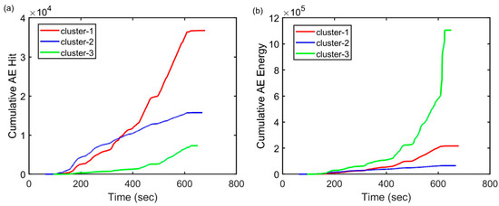 Variation in cumulative AE features of the clusters obtained from the sensor 6 data of slab 1. (a) AE cumulative hit and (b) AE cumulative energy.