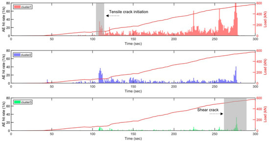 AE hit rate and load versus time of each cluster obtained from the sensor 6 data of slab 1. Grey boxes in clusters 1 and 3 indicate high volume of AE hits detected, which corresponds to the times that the initiations of tensile and shear cracks are visually detected (highlighted with an arrow). The solid red line shows the applied load.