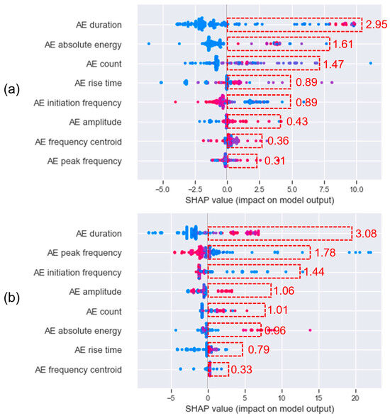 Distribution of SHAP values for AE features. The higher the SHAP value, the higher is the correlation of the AE feature to the crack width growth. The color scale in the SHAP plot signifies feature value magnitude—red for high, blue for low. The red dashed box indicates the mean values of the absolute SHAP values of AE features. (a) Sensor 5 and (b) sensor 6.