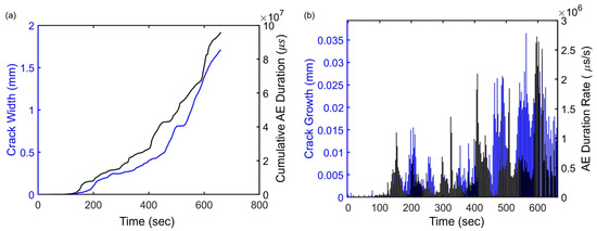 The relationship between AE duration and crack width using the sensor 5 data of slab 1. (a) AE cumulative duration and crack width and (b) AE duration rate per second and crack growth.