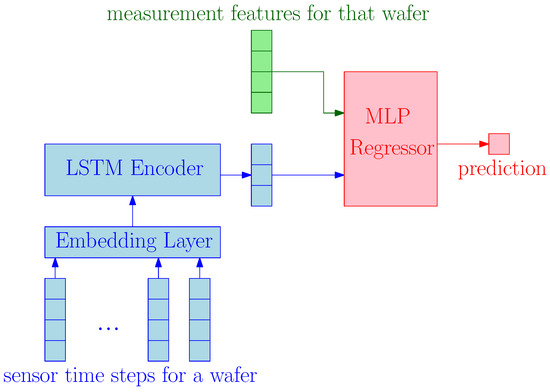 In soft-sensing, there are applications of LSTM-related models in the penicillin fermentation process [7], the debutanizer column process [7,8], grinding classification process [9] and the wastewater treatment process [8], which demonstrate the capacities of the LSTM architecture in various industries. Although these LSTM-based soft-sensing regression models have been proposed for certain fabrication processes, their performance of general metrology in a real-world wafer manufacturing setting has not yet been investigated. Unlike other industries, wafer manufacturing has various measurement types, processes and precision requirements, and therefore requires the model to flexibly accommodate different circumstances. As such, this study proposes an LSTM-based soft-sensing regression model to forecast wafer metrology, with the aim of testing its performance in a real manufacturing process. This work seeks to answer the following research questions: