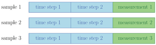 Our data preprocessing is outlined in Figure 4. The data are split into training, validation and test sets by a chronological ratio of 7:2:1. Due to the constraint of storage and computing resources, we only focus on the 33 most common (KQI, TYPE) of wafers. Because different columns have different scales, we use linear transformations to normalize each feature in the sensor training set to the interval , then use the same linear transformations to transform the validation and test set. The missing values in the sensor readings are imputed with the medians. Those samples with meas_med outside the range [−1, 1000] are dropped in the training set because they are likely to be measurement errors. The dropped samples consist of less than 1% of the whole dataset. One-Hot Encoding are performed on the five categorical columns in the sensor data and five categorical columns in the measurements data. After that, we have 267 and 552 features in sensor and measurement data, respectively. The sensor data and measurements data are joined before model training. An example can be found in Figure 5, where in this example, the wafer has two time steps and three measurements. The join operation concatenates these two time steps in a row and joins them with every one of the three measurements, resulting in three samples after preprocessing.