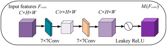 In SAM, two 7 × 7 convolutional layers are used successively to reduce and increase the number of channels to achieve the purpose of centralizing spatial feature information. This strategic operation can reduce the amount of calculation and fuse spatial information. Meantime, the conventional maximum pooling layer is removed from the SAM to further preserve the spatially useful information feature map. Finally, the output, , is obtained through leaky ReLU activation. The structure visualization of the SAM network architecture is shown in Figure 4, and the specific operations are as follows: