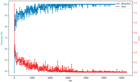 After preparing the datasets and determining the parameters required for training the model, the training model can be started. The GM-ResNet is trained based on the pre-training model of the ImageNet large-scale image datasets. Training based on the weight of the pre-training model can speed up the training speed and make the training effect reach its optimum as soon as possible. As shown in Figure 9, the training accuracy and loss curve of the GM-ResNet road crack detection model are depicted. Notably, over a span of 10 training epochs encompassing 6280 iterations, the model’s training accuracy approaches a state of stability, yielding remarkable precision. This is accompanied by a downward trend in loss, reaching a minimal value. By observing the fluctuation state of the curve, we can see that the model has excellent stability and robustness in the training process. After 3000 iterations, the fluctuation of the accuracy rate and loss curve basically tends to be stable, with only occasional small oscillations. At the same time, it is often not comprehensive enough to assess the ability and performance of the holistic model by relying solely on the evaluation indicator of accuracy. Therefore, recall, precision and F1-score are introduced as auxiliary measurement indicators. The specific definitions and calculation rules of the three evaluation indicators are as follows: