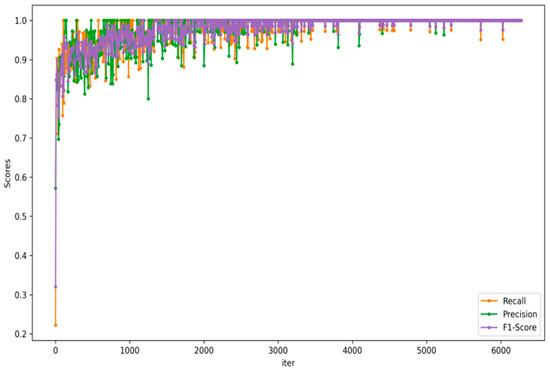 Therefore, the visualization curves of the three evaluation indicators of the GM-ResNet are shown in Figure 10. According to the figure below, when the GM-ResNet has achieved satisfactory effects in terms of recall, its precision and F1-score can be seen. Remarkably, as the training iterations advance, the F1-score steadily approaches unity, an encouraging indicator of the exceptional precision and recall achieved through the training process of the proposed model, which further verifies the robustness and supremacy of our model within the field of road crack detection.